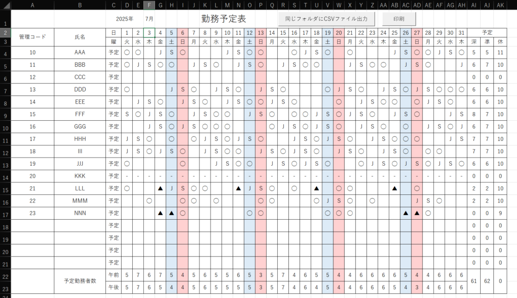- ボタン1つで印刷用PDFとジョブカン用CSVを出力